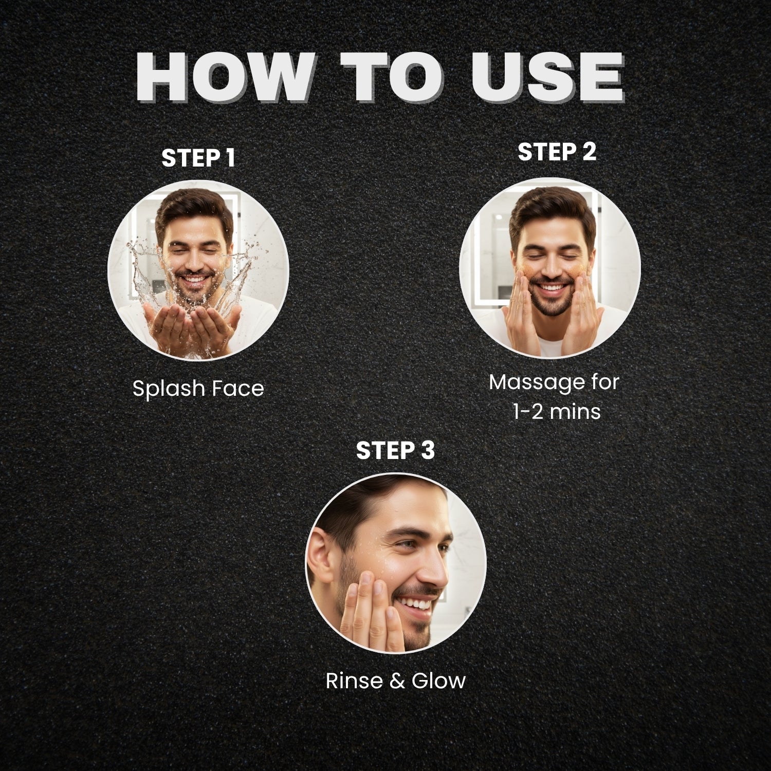 Splash some water on your face, gently massage with sufficient amount of scrub in circular motion with your fingertips on your face for about 1-2 mins avoiding eyes, rinse it off with water.